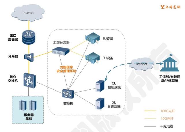 組網(wǎng)應(yīng)用 1、并聯(lián)組網(wǎng) 龍翊信息安全管理系統(tǒng)并聯(lián)組網(wǎng),是在 IDC 機(jī)房出口路由器設(shè)備的出口鏈路上加分光 器,經(jīng)分光器復(fù)制之后的一條鏈路仍連接原有上聯(lián)的網(wǎng)絡(luò)設(shè)備,另外一條鏈路接入執(zhí)行單元 的匯聚分流設(shè)備。匯聚分流設(shè)備具有一定的過(guò)濾功能,將過(guò)濾之后的數(shù)據(jù)傳給分析監(jiān)控服務(wù) 器,另外也通過(guò)一條鏈路與 IDC 核心網(wǎng)絡(luò)設(shè)備連接,通過(guò)發(fā)送數(shù)據(jù)包中斷或干擾用戶正常業(yè) 務(wù)連接達(dá)到對(duì)用戶流量的控制。根據(jù)現(xiàn)網(wǎng)業(yè)務(wù)流量匯聚的不同情況,分光器部署可以在匯聚交換機(jī)與機(jī)房出口匯聚路由器之間,或者是機(jī)房出口匯聚路由器與園區(qū)出口路由器之間,以 確保對(duì)全量業(yè)務(wù)流量進(jìn)行分光。信息安全管理系統(tǒng)并接方式的網(wǎng)絡(luò)結(jié)構(gòu)如下圖所示: